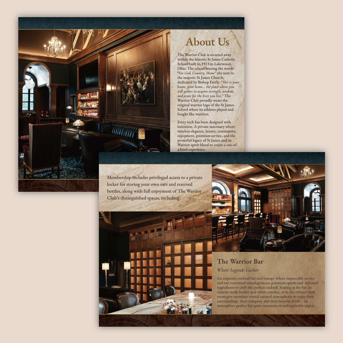 This booklet, business card, and other collateral was all created for a local private club called the Warrior Club. While the logo was created by another designer, I was responsible for creating a cohesive visual identity for the club’s marketing materials. I made use of wood, marble, and other textures to align with the physical interior of the space.